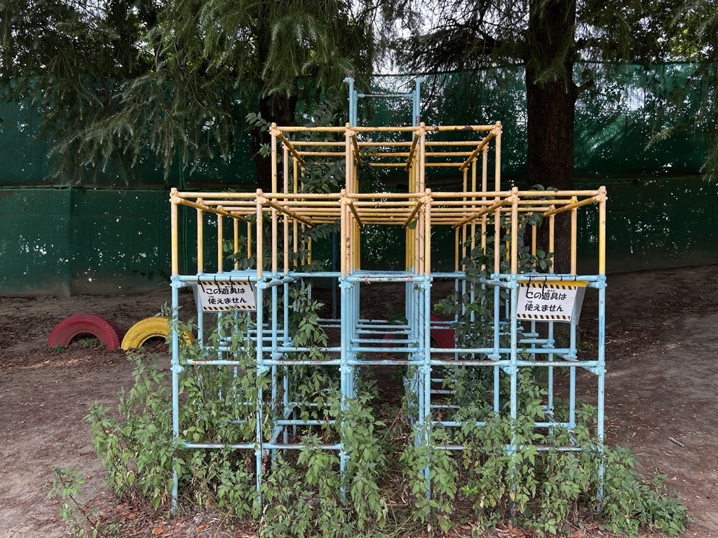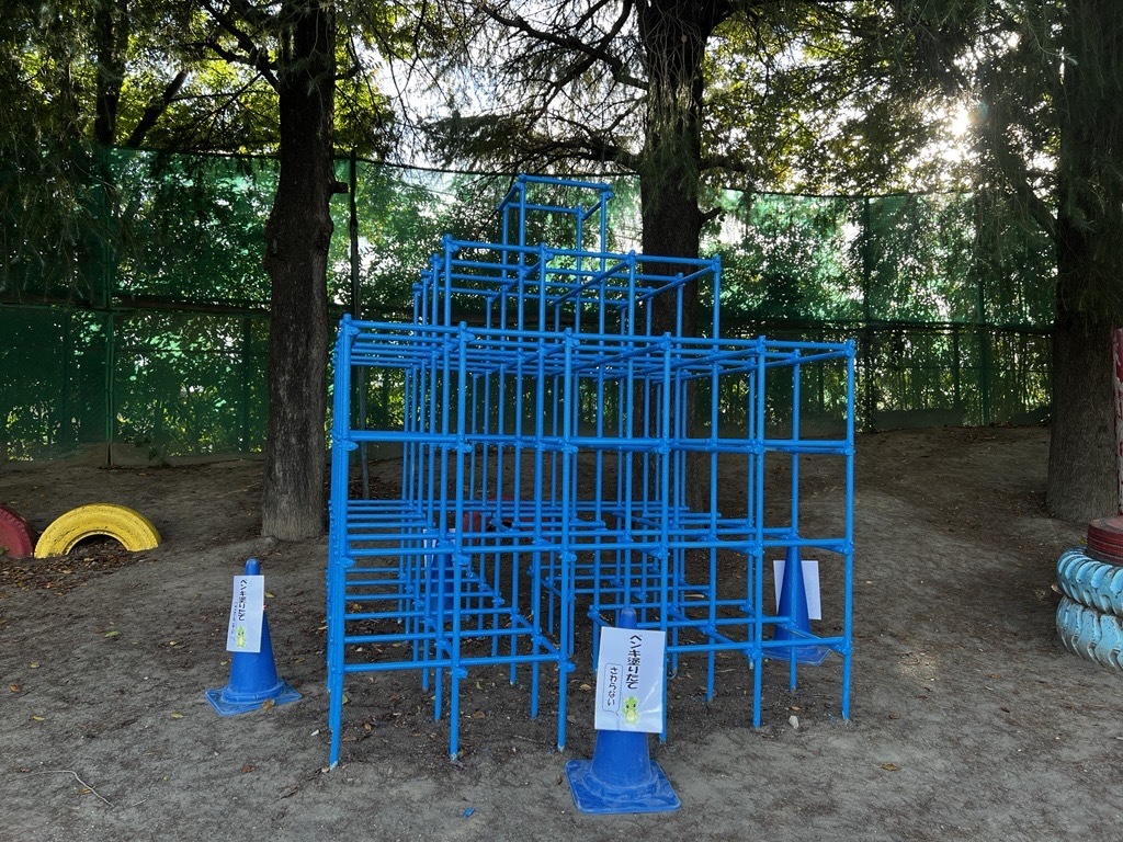ジャングルジムはバーが外れ、数年の間使用禁止となっておりました。今回バーの取り付け修繕及び塗装を行い、再び使用可能となりました。